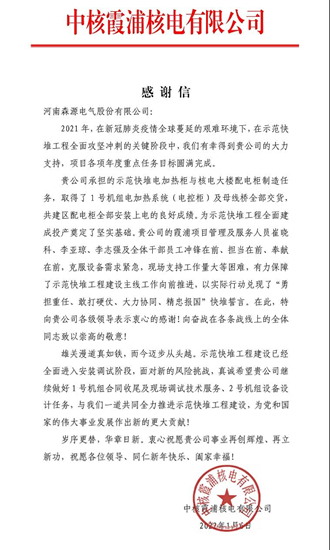 森源电气再次收到中核霞浦核电有限公司感谢信