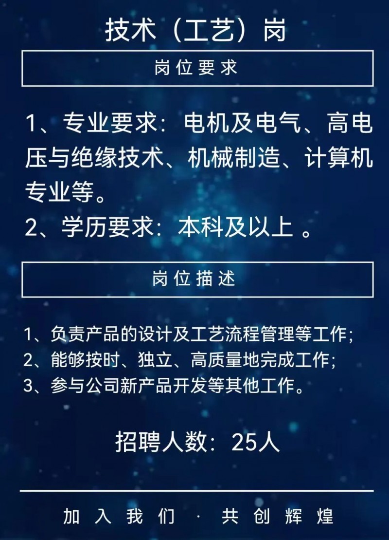 招聘部门 | 技术部 工艺部 | 招聘人数 | 25人 |