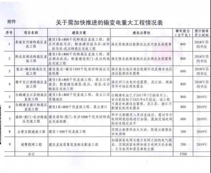 2018年9月3日,国家能源局曾印发《关于加快推进一批输变电重点工程规划建设工作的通知》,提出将于2018年四季度到2019年年底前核准12条特高压线路。