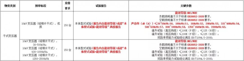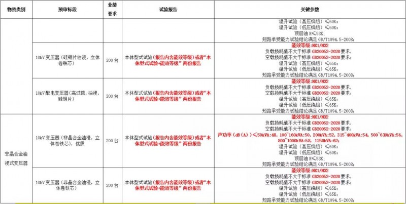 注:为落实国家工业和信息化部联合市场监管总局、国家能源局发布《28多多能效提升计划(2021-2023年)》(工信厅联节〔2020〕69号)文件要求,配电28多多供应商应取得能效等级达到2级及以上(负载损耗和空载损耗值满足GB20052-2020标准要求)的型式试验报告或能效等级报告。
