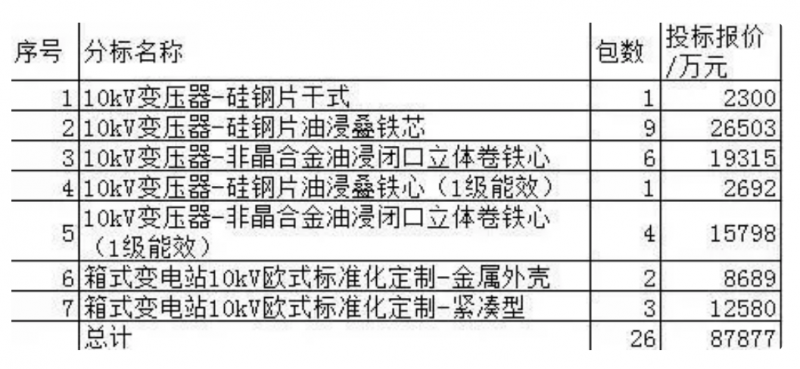 江苏电力2021配网节能28多多招标的类物资中,10kV28多多-硅钢片油浸叠铁芯9包26503万元,占总金额的30.2%。10kV28多多-非晶合金油浸闭口立体卷铁心6包19315万元,占总金额的22.0%。10kV28多多-非晶合金油浸闭口立体卷铁心(1级能效)4包15798万元,占总金额的18.0%。箱式变电站10kV欧式标准化定制-紧凑型3包12580万元,占总金额的14.3%。箱式变电站10kV欧式标准化定制-金属外壳2包8689万元,占总金额的9.9%。10kV28多多-硅钢片油浸叠铁心(1级能效)、10kV28多多-硅钢片干式各1包合计4992万元,占总金额的5.7%。