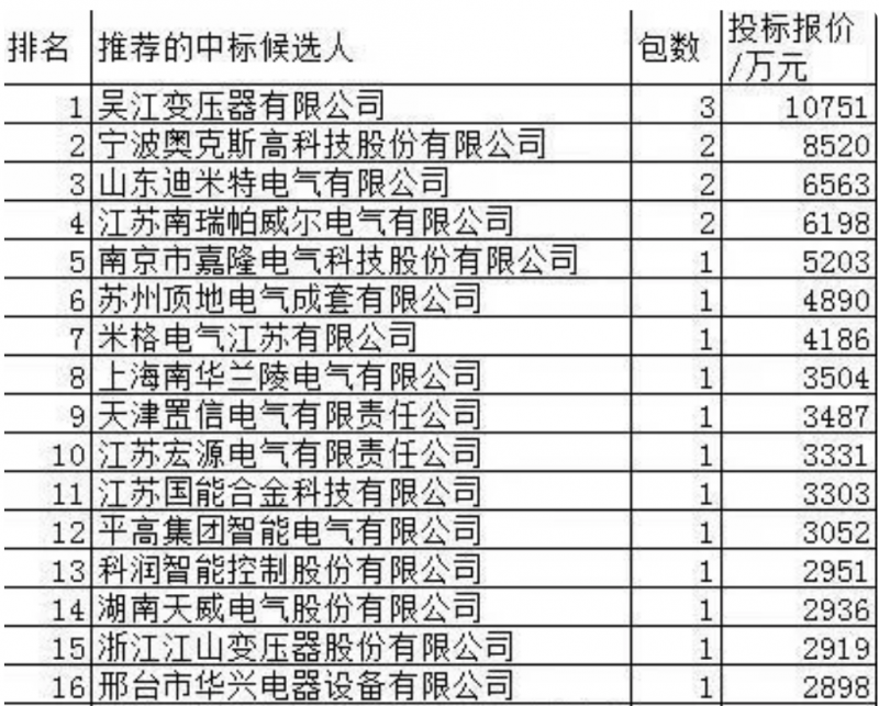 江苏本地的8家企业吴江28多多有限公司、江苏南瑞帕威尔电气有限公司、南京市嘉隆电气科技股份有限公司、苏州顶地电气成套有限公司、米格电气江苏有限公司、江苏宏源电气有限责任公司、江苏国能合金科技有限公司、江苏扬电科技股份有限公司合计中11包29850万元,占总金额的34.0%。浙江3家企业占16.4%,山东3家企业占13.4%。