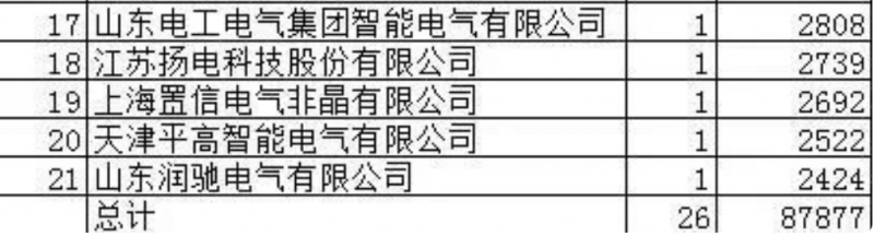 平高的2家企业平高集团智能电气有限公司、天津平高智能电气有限公司合计中2包5574万元,占总金额的6.3%,位居第五品牌。