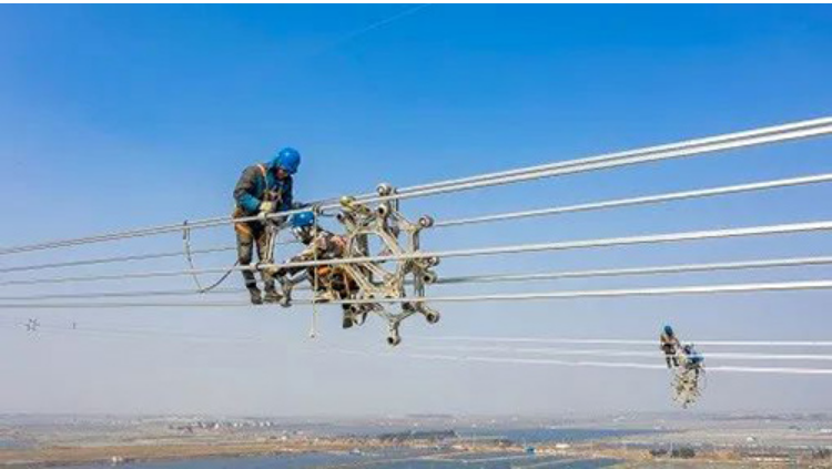 国网江苏电力员工在线路上安装间隔棒。