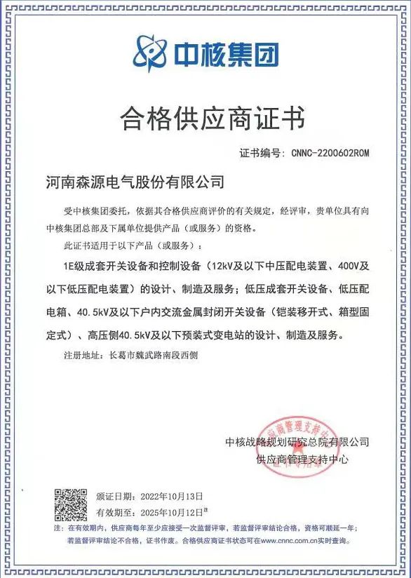 核心提示:硬核肯定!森源电气再度获得中核集团合格供应商证书