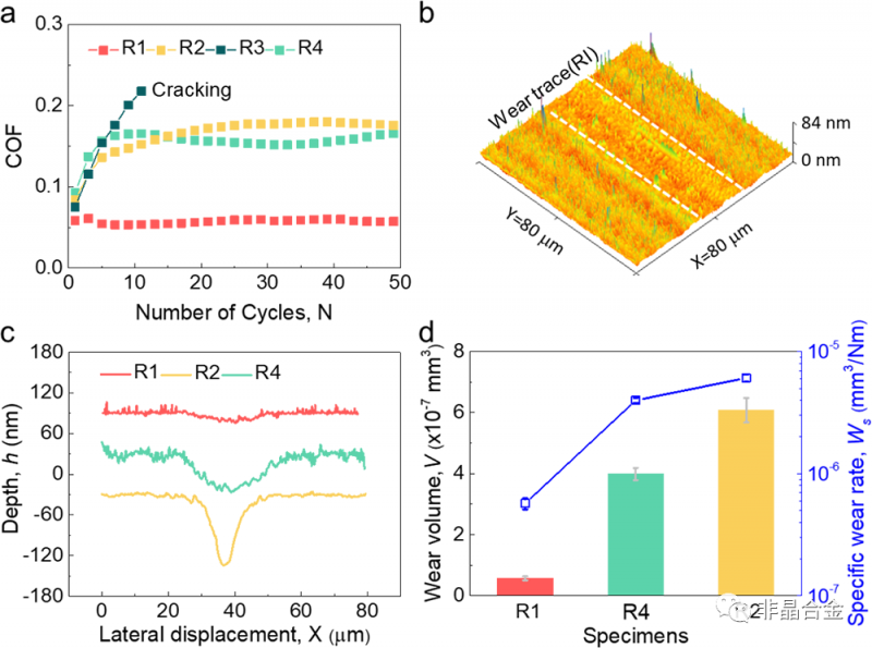 这样的摩擦磨损性能已经接近相似测试条件下类金刚石材料的摩擦磨损性能(图3)。这些结果不仅证明了新发展的高通量力学表征方法对快速筛选强韧化非晶合金成分的有效性,更有助于理解非晶合金耐磨性的起源。