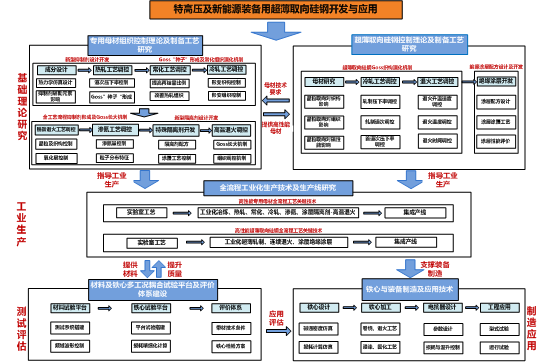基于项目总体思路,依据以下技术方案,开展高性能专用母材、超薄取向硅钢、工业化生产技术及集成产线、材料及铁心多工况耦合试验评价、铁心与装备制造及应用等研究工作。