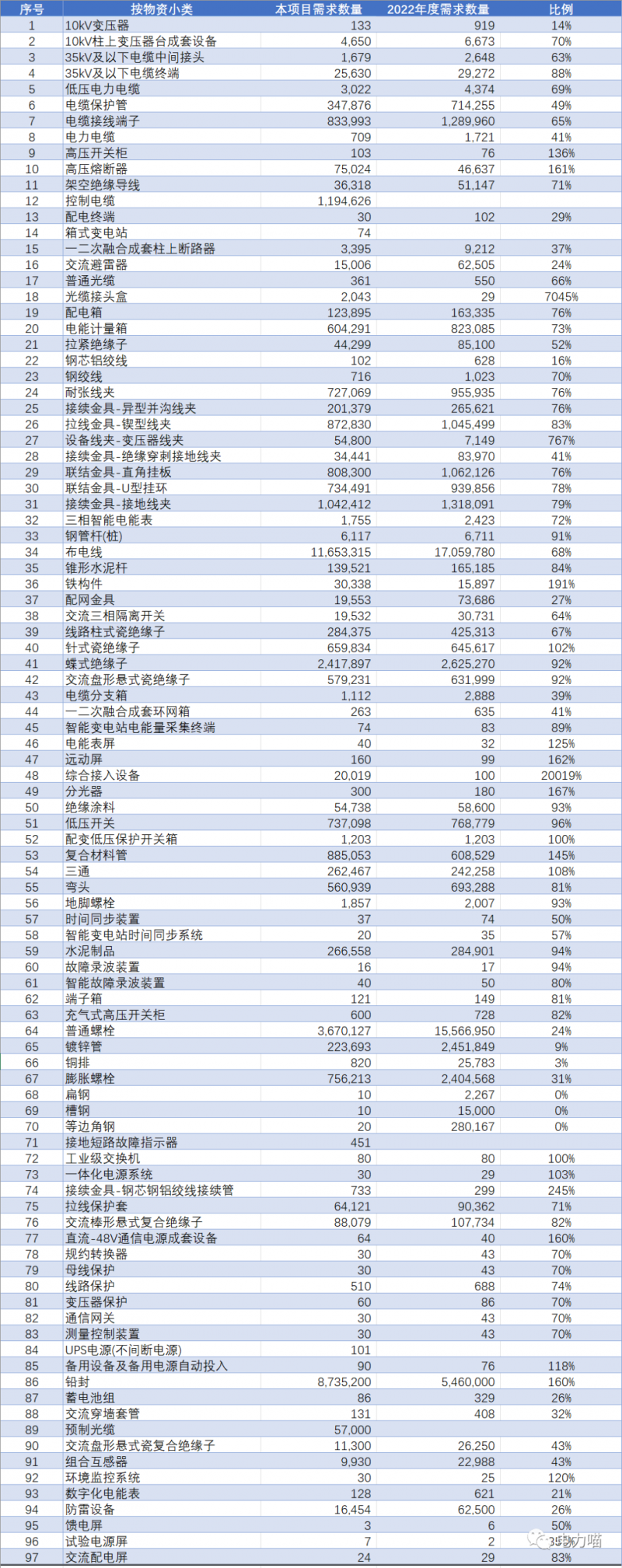 从各物资小类需求数量看,本次项目部分物资的招标数量超过2022年度全年需求数量,如高压开关柜、高压熔断器、光缆接头盒、综合接入设备;比例最低的扁钢等钢材料。