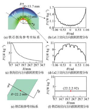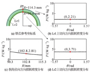 2. 不同结构纳米晶铁心典型位置损耗分析为便于分析,研究人员对铁心拐角和铁心柱建立参考坐标系,选取典型位置分别进行沿径向方向和切向方向的损耗密度分析;并且对三角形铁心、O型铁心径向和切向不同位置的损耗密度进行分析。见图4、5。