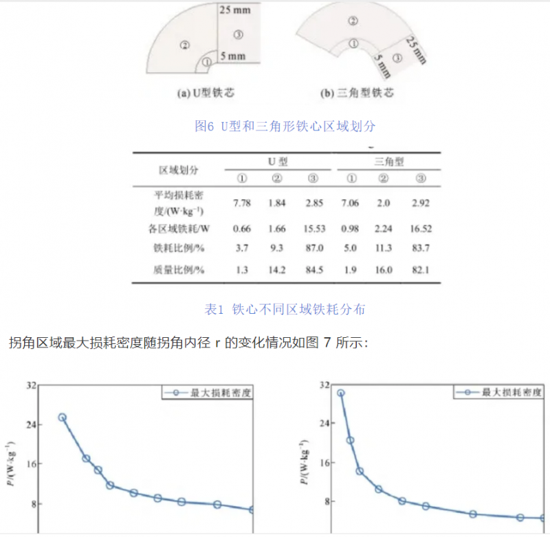 进一步研究U型和三角形铁心损耗分布,研究人员还对铁心拐角进行区域划分,然后计算分析不同区域的铁耗分布情况。