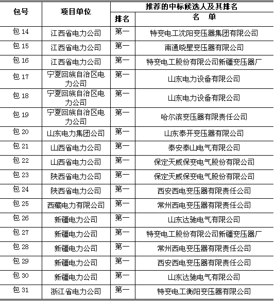国家电网2014年变电项目第六批电抗器中标名单