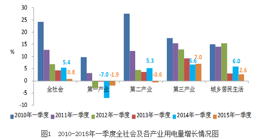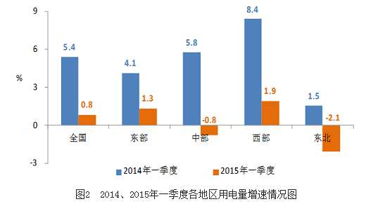 受宏观经济尤其是工业生产下行、产业结构调整以及气温偏暖等因素影响,一季度全社会用电量同比增长0.8%,创2009年三季度以来的季度最低增速;第二产业用电同比下降0.6%,其中黑色金属冶炼和建材行业用电同比分别下降6.8%和4.4%、增速同比分别回落8.5和15.1个百分点,四大高耗能行业对全社会用电增长的贡献率为-48.1%;城乡居民生活用电同比增长2.6%,增速同比和环比分别回落3.3和1.2个百分点;第三产业用电增长7.0%,维持较快增长,其中信息业消费持续保持旺盛势头。发电新增装机创同期最高水平、电力供应能力充足,全国全口径发电装机容量13.8亿千瓦,其中并网风电装机容量突破1亿千瓦,非化石能源发电量持续快速增长,火电发电量自2014年7月份以来持续负增长、设备利用小时同比下降。全国电力供需总体宽松,运行安全稳定。