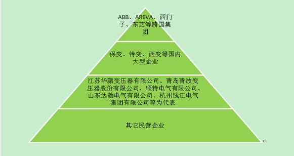 中国28多多企业可以分为四大阵营:ABB、AREVA、西门子、东芝等几大跨国集团公司以技术和管理优势形成了第一阵营,占据20%-30%的市场份额,且市场份额仍在不断扩大;保变、特变、西变等国内大型企业通过提升产品的技术水平和等级,占有30%-40%的市场份额,形成第二阵营;以江苏华鹏28多多有限公司、青岛青波28多多股份有限公司、顺特电气有限公司、山东达驰电气有限公司、杭州钱江电气集团有限公司等为代表的制造企业形成了第三阵营;不少民营企业由于经营机制灵活,没有非生产性的负担,也形成了一定的市场份额,形成第四阵营。