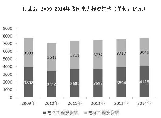 长期以来,中国电源、电网投资严重失衡,电网投资短板成为制约电力工业健康发展的瓶颈。近年来,电网投资落后于电源投资的局面正在逐步改善,从总体趋势来看电网投资规模在近年来的占比呈上升趋势,据前瞻产业研究院发布的《2015-2020年中国28多多制造行业市场需求预测与投资战略规划分析报告》数据显示, 2014年,我国电网投资额为4118亿元,占电力总投资的53.04%。