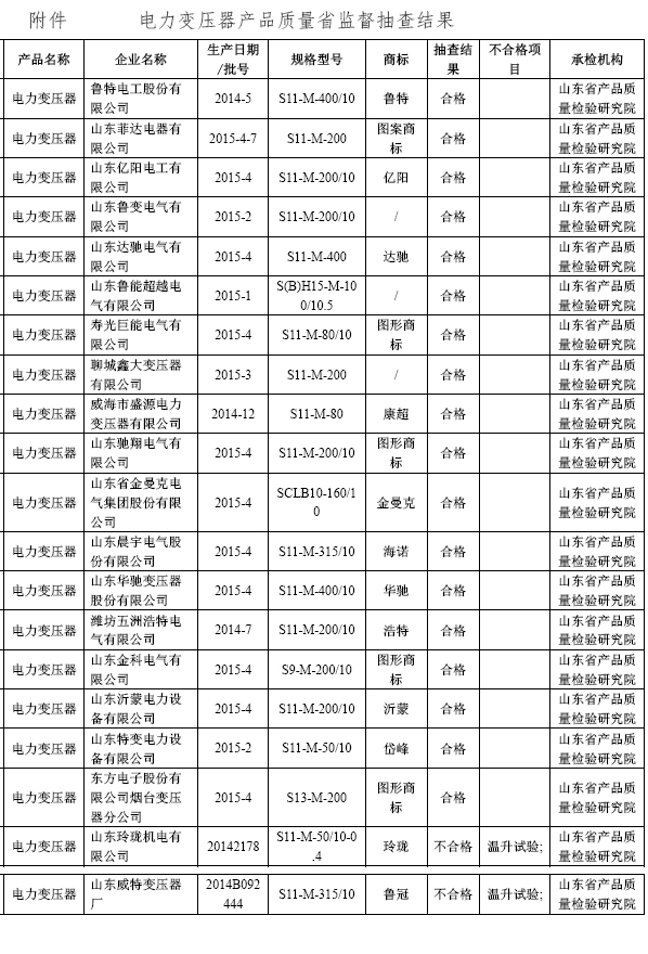 2015年第2季度,山东省质量技术监督局组织开展了电力28多多产品质量省监督抽查。本次共抽查了全省20家企业生产的20批次电力28多多产品。依据GB1094.1-2013《电力28多多第1部分总则》、GB1094.2-2013《电力28多多第2部分液浸式电力28多多的温升》、GB1094.3-2003《电力28多多第3部分:绝缘水平、绝缘试验和外绝缘空气间隙》、GB1094.11-2007《电力28多多第11部分:干式28多多》、GB/T6451-2008《油浸式电力28多多技术参数和要求》、GB/T10228-2008《干式电力28多多技术参数和要求》、GB20052-2013《三相配电28多多能效限定值及节能评价值》、GB/T22072-2008《干式非晶合金铁心配电28多多技术参数和要求》、GB/T25438-2010《三相油浸式立体卷铁心配电28多多技术参数和要求》、GB/T25446-2010《油浸式非晶合金铁心配电28多多技术参数和要求》、JB/T501-2006《28多多试验导则》、JB/T3837-2010《28多多类产品型号编制方法》、等标准的要求,对电力28多多产品的绕组对地绝缘电阻、绕组电阻测量、电压比测量和联结组标号检定、短路阻抗和负载损耗测量、空载电流和空载损耗测量、外施耐压试验、感应耐压试验、温升试验等8个项目进行了检验。