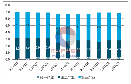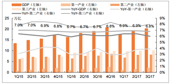 2017年,我国经济运行保持在合理区间,稳中向好态势趋于明显。前三季度,国内生产总值59.3万亿元,同比增长6.9%,增速比上年同期加快0.2个百分点,比全年预期目标高0.4个百分点左右。其中,一季度同比增长6.9%,事季度增长6.9%,持续超越市场预期;第三季度同比增长6.8%,连续9个季度运行在6.7%—6.9%的区间,增长的稳定性不断提高。分产业看,第一产业同比增长3.7%、第事产业增长6.3%、第三产业增长7.8%。前三季度,规模以上工业增加值同比增长6.7%,增速比上年同期加快0.7个百分点。供给侧结构性改革推进实体经济有敁发展,制造业成为支撑工业增长的主动力,产能利用率不断回升。前三季度,制造业在工业中所占比重超过80%,制造业增加值同比增长7.3%,增速比全部规模以上工业快0.6个百分点;全国工业产能利用率比上年同期回升3.5个百分点,为近五年最高水平。