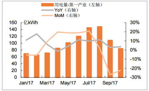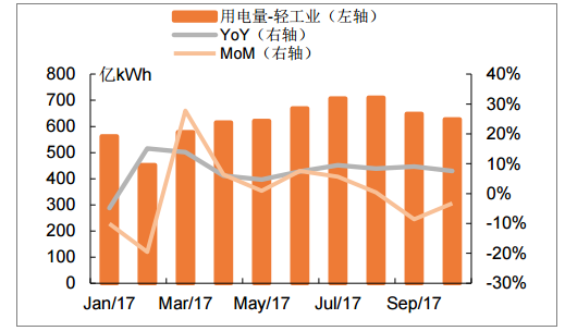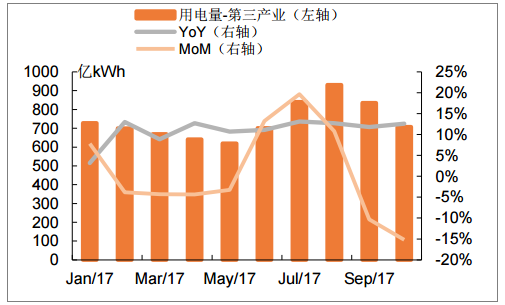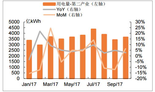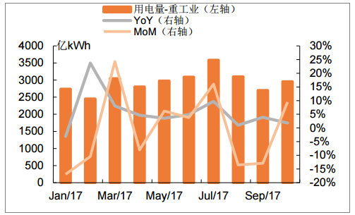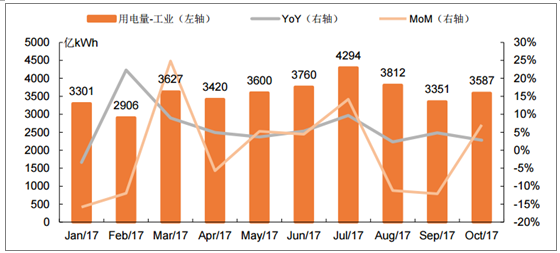 国民经济的稳定增长也带来了全社会用电量增长超过预期——1-10月全社会用电量达5.20万亿千瓦时,同比增长6.7%,为2014年以来同期最高,增速同比提高1.9个百分点。分产业看:第一产业用电量995亿千瓦时,同比增长7.4%,比16年同期提高2.1个百分点;第二产业用电量36280亿千瓦时,同比增长5.7%,比16年同期提高3.4个百分点;第三产业用电量7367亿千瓦时,同比增长10.7%,比16年同期下降0.9个百分点;城乡居民生活用电量7376亿千瓦时,同比增长7.6%,比16年同期下降4.0个百分点。