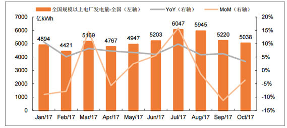 2017年1-10月全国规模以上电厂发电量同比增长6.0%
