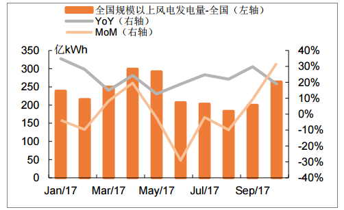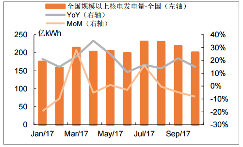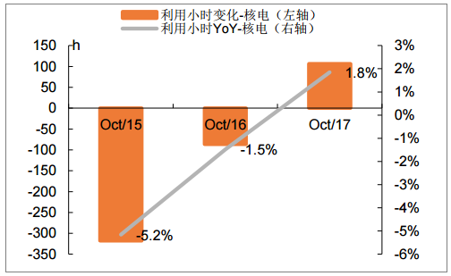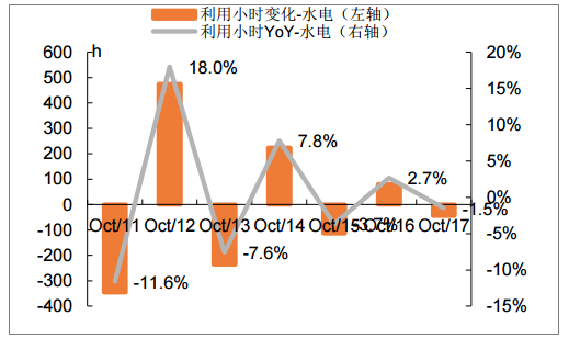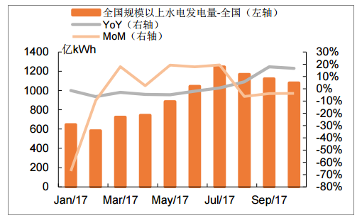 与2016年全年相比,2017年1-10月水电发电量在总发电量中的占比下降1.9个百分点、火电占比上升1.5个百分点、核电上升0.3个百分点、风电上升0.6个百分点。上半年水电出力不足,带动了其他发电设备得以多发。