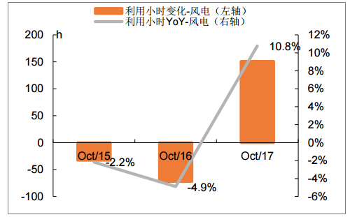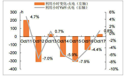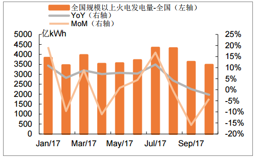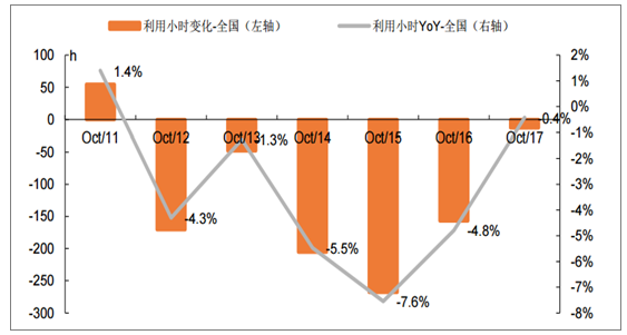 发电量增速提高,与装机容量增速放缓叠加,得到的结果就是设备利用小时数的改善。2017年1-10月,全国发电设备累计平均利用小时3109小时,同比降低13小时,比2016年同期改善175小时。其中:全国水电设备平均利用小时为3024小时,同比降低45小时,比2016年同期回落125小时;全国火电设备平均利用小时为3431小时,同比增长26小时,比2016年同期改善223小时;全国核电设备平均利用小时为5873小时,同比增长107小时,比2016年同期改善422小时;全国风电设备平均利用小时为1552小时,同比增长151小时,比2016年同期改善179小时。除水电外,火电、核电、风电的利用小时数均呈同比改善趋势。利用小时的改善表明,连续3年宽松供需状态的拐点已经到来,供给逐步向需求靠拢,2018年即有望达到平衡。