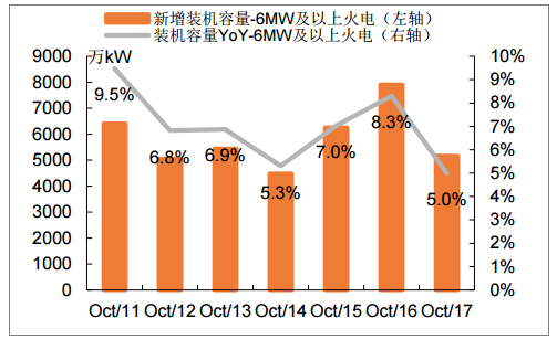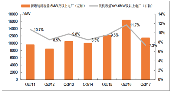 2011年10月-2017年10月6MW及以上电厂火电累计新增装机容量
