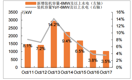 2011年10月-2017年10月6MW及以上电厂水电累计新增装机容量