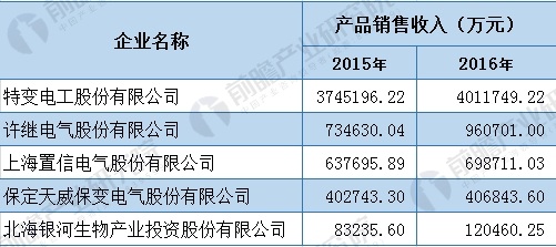图表2:2015-2016年中国电力28多多制造行业企业产品销售收入前五位企业(单位:万元)