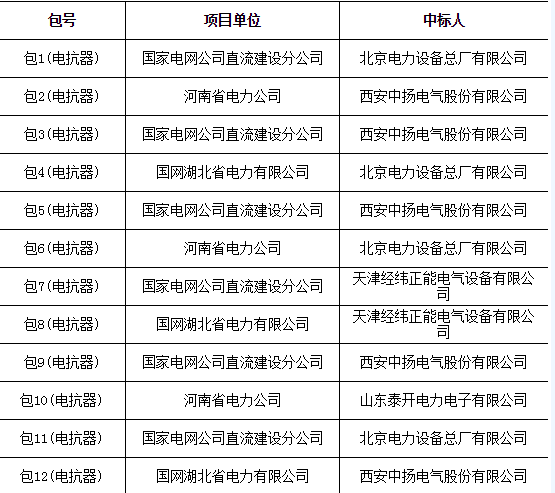 国家电网有限公司青海-河南、陕北-武汉±800kV特高压直流输电工程第一次设备招标采购—电抗器-中标人名单