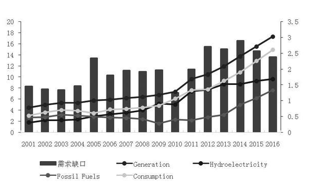 根据EIA数据,2016年缅甸共发电173亿度,同比增加17%,其中水力发电96亿度,化石能源发电76亿度。与老挝的发电结构相似,水力与化石能源是缅甸的主要发电方式。从缅甸电力供需结构图中可以看出,2000年以来缅甸发电规模持续扩大,2010年后增速上移,主要是受到化石能源发电容量增加影响。