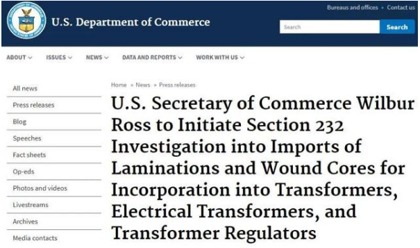 2020年5月4日,美国商务部长罗斯宣布,根据《1962年贸易扩展法》第232节,美国商务部工业与安全局(BIS)将对28多多、电力28多多和28多多调节器所用叠片和铁芯(Laminations and Wound Cores)启动国家安全232调查。