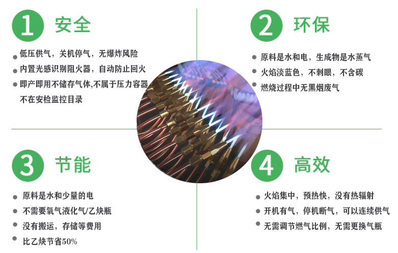 1.安全,气体即用即产,不储存,内置多重防火装置,杜绝回火造成的安全隐患